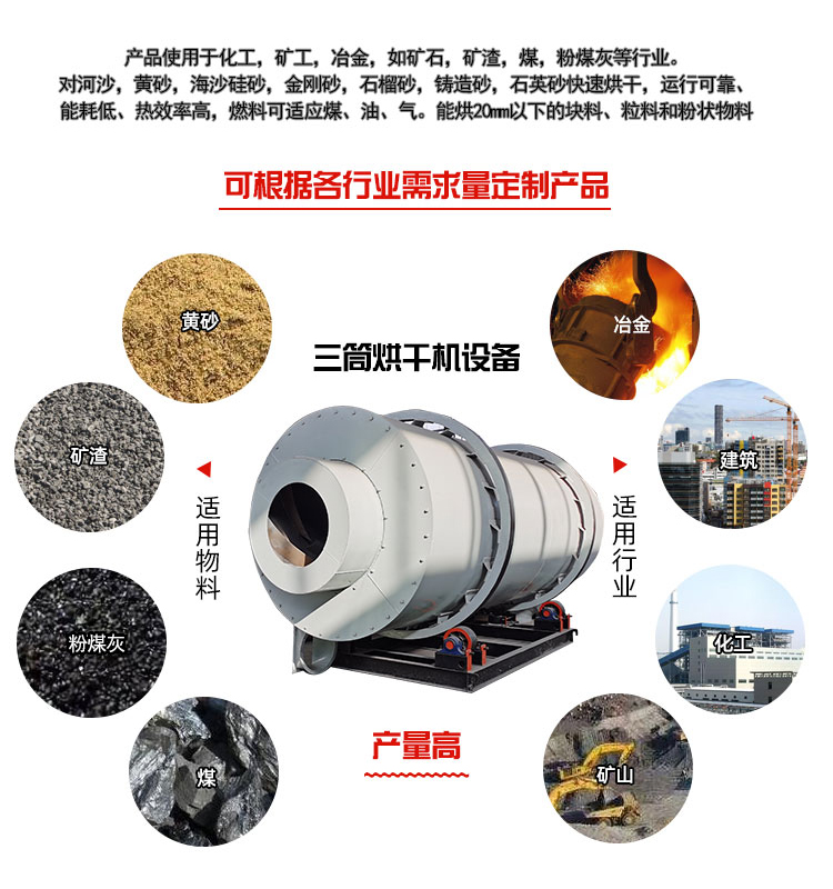 2.三筒烘干機(jī)主要用于烘干一定濕度范圍內(nèi)顆粒物料,如干粉砂漿行業(yè)所用的黃砂、鑄造行業(yè)用的各種規(guī)格型砂。建材水泥行業(yè)用的高爐礦渣。小粒度粘土,化工行業(yè)用于不起化學(xué)變化、不怕高溫及煙塵弄臟的小顆粒物料。根據(jù)不同行業(yè)對(duì)烘干后物料終水份要求,烘干后的物料含水量可以達(dá)到1—0.5%以下。